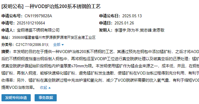 2025年5月13日,寶鋼德盛不銹鋼有限公司成功申請(qǐng)一項(xiàng)名為“一種VOD爐冶煉200系不銹鋼的工藝”專利,申請(qǐng)公布號(hào)為CN119979828A,申請(qǐng)日期為2025年1月26日。