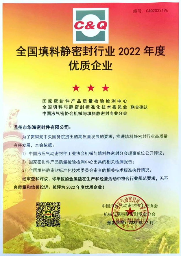 浙江省科技型中小企業(yè)證書                                       2022年度中國液壓氣動密封件工業(yè)協(xié)會企業(yè)證書